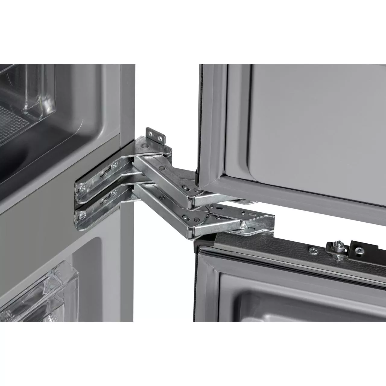 Холодильник имеет жесткую систему крепления фасадов. При таком монтаже фасады не связаны с корпусом шкафа и не предполагают наличие дополнительных петель. Конструкция не ограничена углом открывания и не имеет зазоров, в которых может скапливаться пыль и грязь.